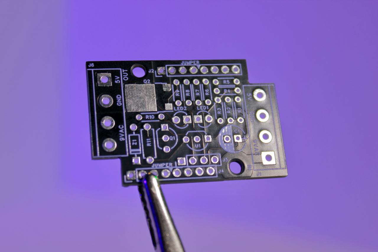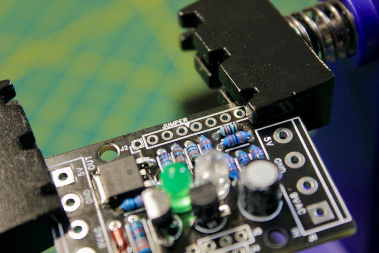 Finally, take some of your trimmed leads and use them to make a jumper in the two rows of empty holes. There are two small arrows with the word "JUMPER" in each row, so bend a lead in half and drop it into the holes on either side of the jumper. You can solder these from the top.