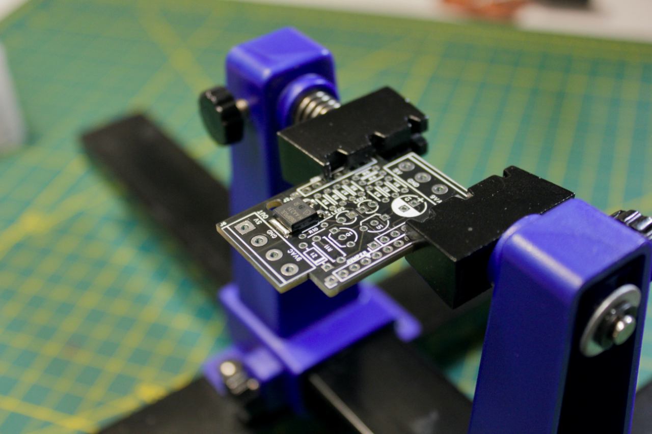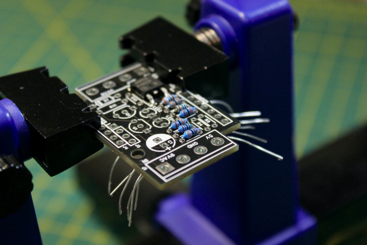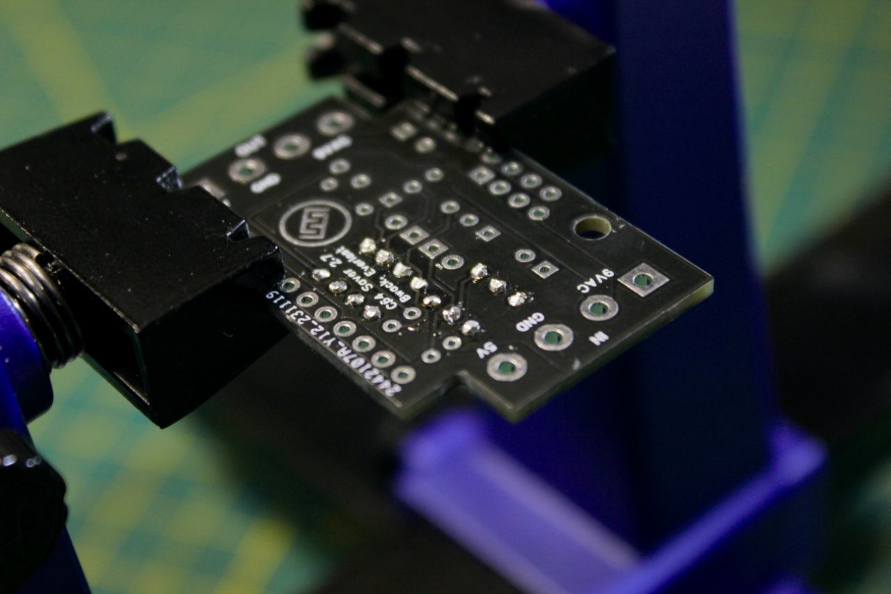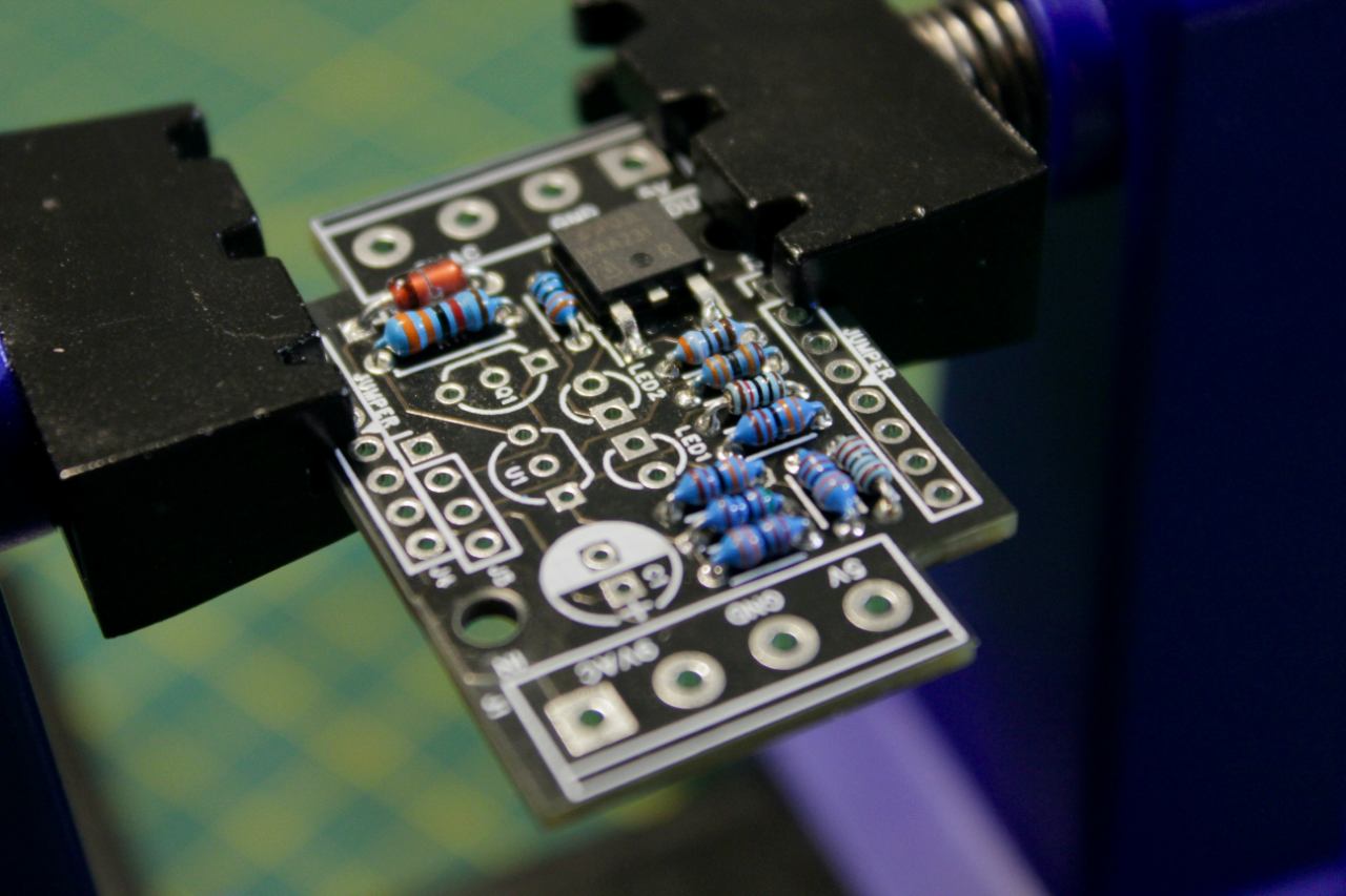 Find a nice way to hold the board, and let's install Q2, the MOSFET, first. I use lots of flux, tack down the chip by its little feet, then heat the edge of the sink at the top and wait for solder to wick down using high heat.