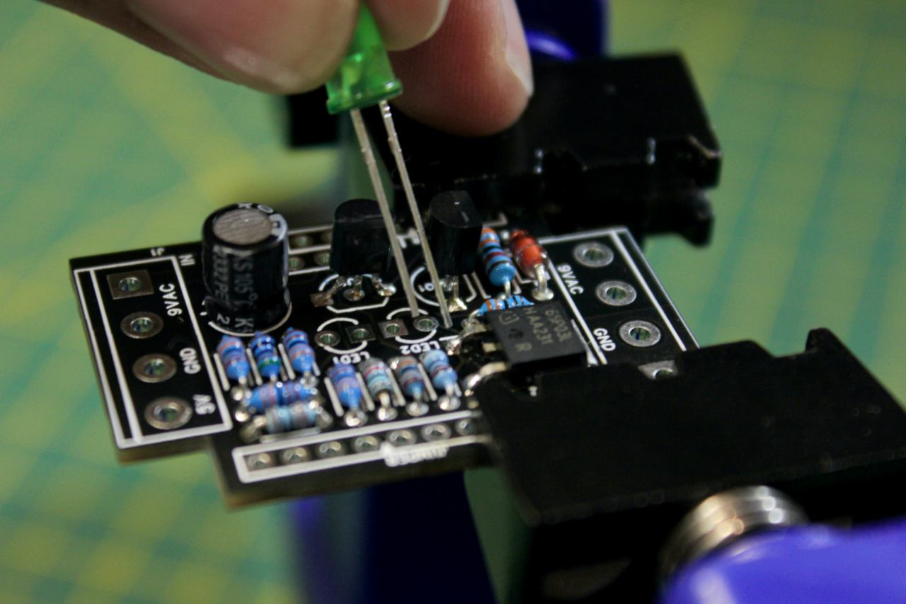 When you go to add the LEDs, notice that the longer lead on the LED goes into the round pad on the board. Also, the body of the LED usually has a flat "edge" which is marked on the PCB. The two flat edges on the LEDs face each other.