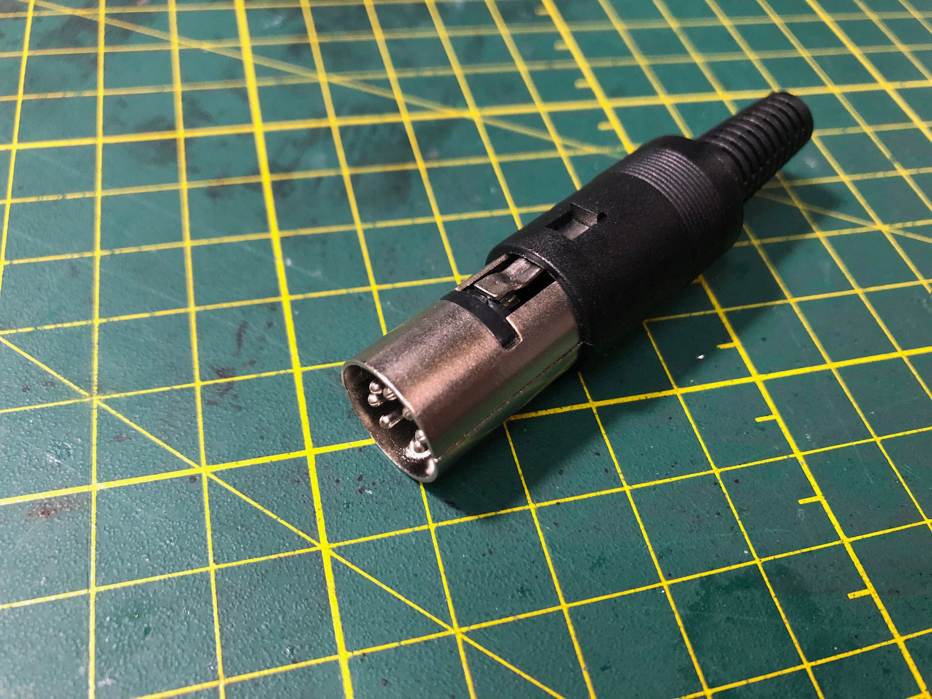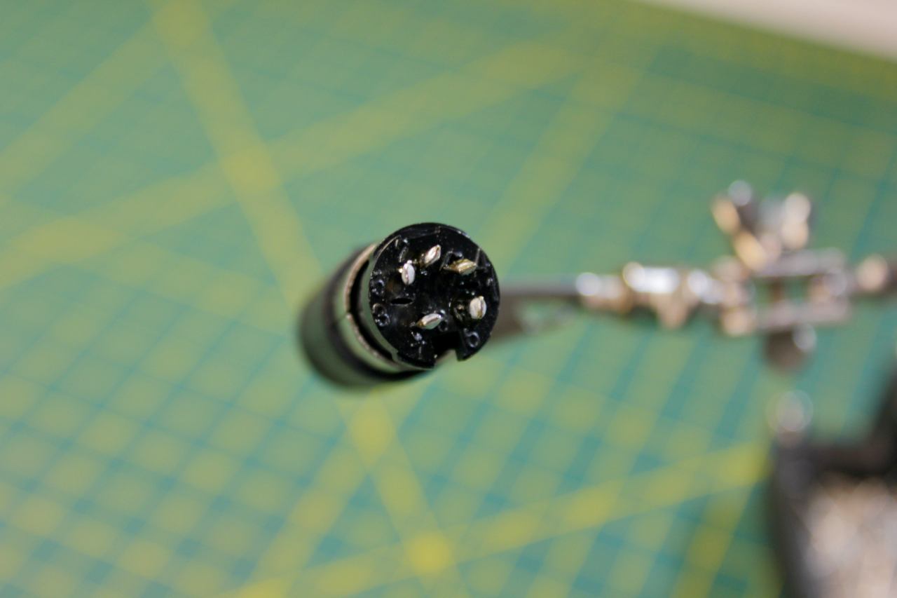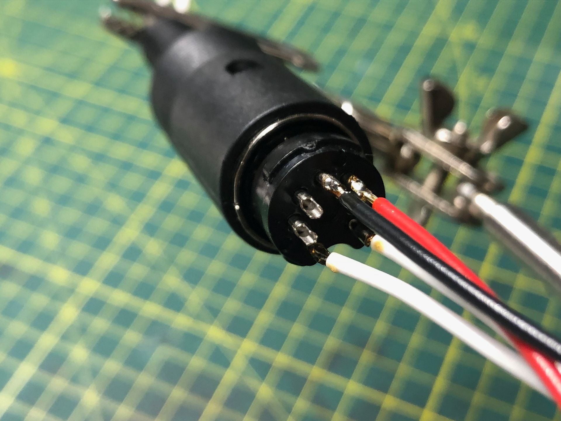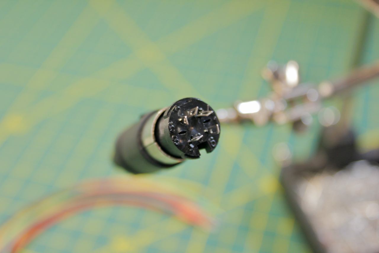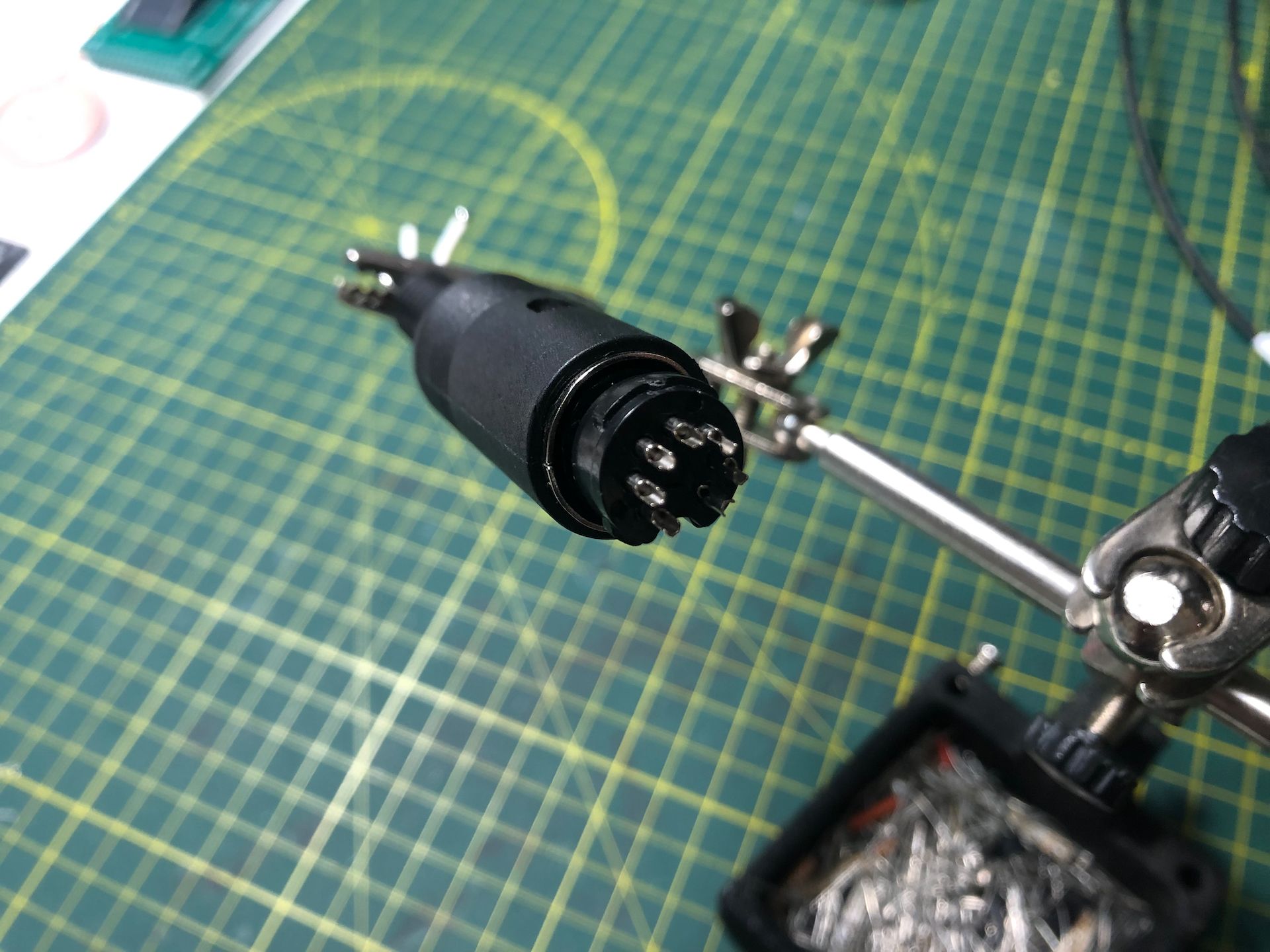 Notice that I'm using the other DIN connector to hold this one. This is because the heat from soldering will actually allow the plastic to move the pins slightly, causing them to be off-center or worse, loose. This works well to keep them in place.